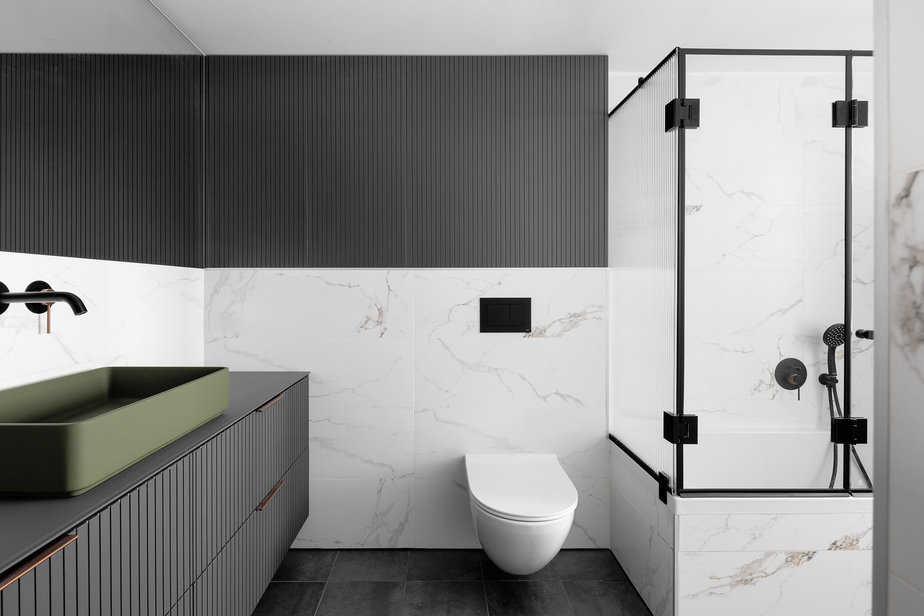 לצד הירוק הדומיננטי, השתלבו גם הצבעים הניטרליים: לבן, שחור ואפור, שבלטו בעיקר בחלל המרכזי במטבח, בריהוט ובקיר הכוח. המטבח נבחר בצבע אפור גרפיט ותוכנן בקפידה בהתאם לצרכיה של בעלת הדירה שעולמה הוא תחום המסעדנות ולכן, היה לה חשוב שיהיה לה מטבח שיענה על צרכיה: אחסון מקסימלי ומשטחי עבודה. הבחירה בצבע האפור מגיעה מהמקום הניטרלי של הצבע, כזה שיתכתב עם חללי הרחצה שנבחרו שלוש שנים קודם לכן.